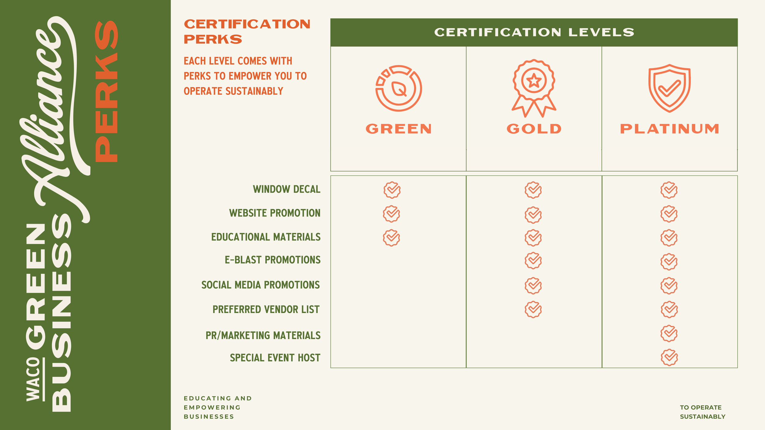Our Green certified Green Businesses' actions qualify them as our entry tier of sustainable businesses in Waco.